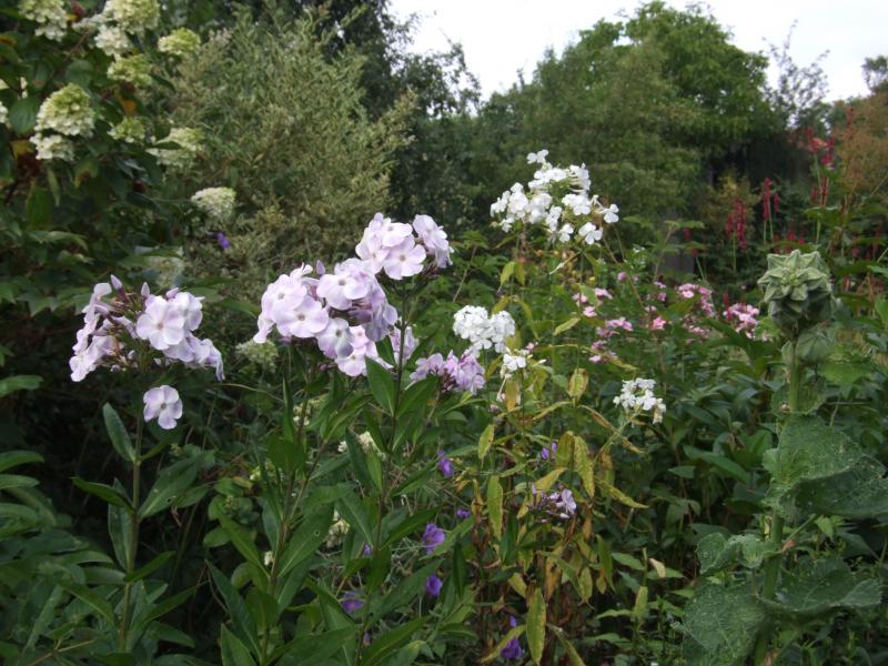 Kein "schönes" Bild, aber interessant: Phlox paniculata ´Alba Grandiflora´war im letzten, regenreichen Sommer sehr schön, dieses Jahr wegen der Trockenheit ein Flop. ´Violetta Gloriosa´vorne und ´Rosa Pastell´hinten zeigen nicht solche Anpassungsschwierigkeiten. (Wühlmäuse unter dem weißen Phlox habe ich ausgeschlossen)