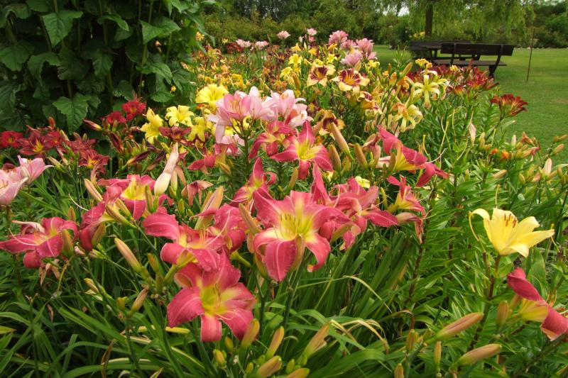 Im Vordergrund'Sweet Child Of Mine' etliche Blüten schon leicht angeknickt.Eine Taglilie,die jedes jahr üppigst blüht.