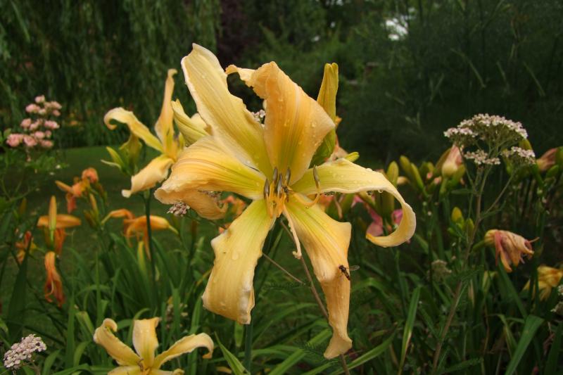 Im Vordergrund'Sweet Child Of Mine' etliche Blüten schon leicht angeknickt.Eine Taglilie,die jedes jahr üppigst blüht.