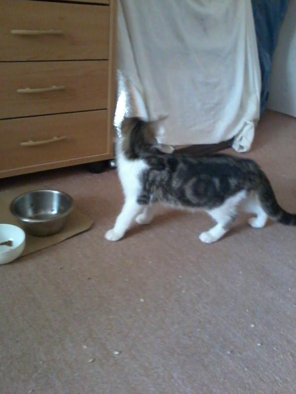 Liebes Gartentigerpersonal,ich möchte Euch gern unsere neuen WG-Mitbewohner vorstellen. Gestern sind sie eingezogen, vorher "wohnten" sie in einem Tierheim, wurden wohl dort abgegeben.Da ist zunächst "Kreisel", sie erhielt ihren Namen, weil sie eine kreisförmige Fellzeichnung auf der linken Flanke hat. 4 Monate alt, neugierig, zutraulich, verfressen, liebt wilde Tobespiele, eine richtige Betriebsnudel, wie es sich für einen Kreisel gehört. Lange stillhalten für ein vernünftiges Foto ist da natürlich nicht drin.