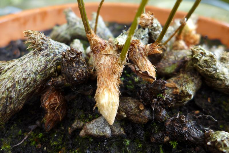 Nach einer kurzen Schlafpause rührt sich wieder Davallia canariensis und schiebt neue, oberirdische Rhizome??? (oder wie soll man sie nennen?), die wie Hasenpfötchen aussehen.Nicht winterhart.