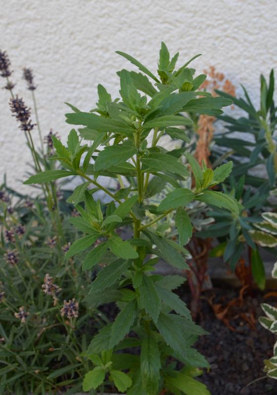 Habe ich auch, aber auch auf der anderen Hausseite.Das einzige, was ich mir vorstellen könnte, ist die Erdmischung in dem Kübel. Da habe ich auch Gartenerde mit untergemischt.Werde morgen mal einen Vergleich mit der Aster und Kalimeris vornehmen...Notfalls muss ich darauf warten, dass sich Blüten bilden.