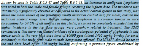 Teil 2.Zur Klärung: Bei einer Tagesdosis von 1,46 g Glyphosat/kg Körpergewicht bei Mäusen* fanden sich unklare Hinweise darauf, dass Lymphome vielleicht häufiger vorkommen als bei Kontrolltieren. Bei niedrigeren Dosen fanden sich keine Hinweise.Und nochmal: Diese Zusammenfassung ist seit über einem Jahr frei im Internet zugänglich.* Das sind bei linearer Umrechnung bei einem Menschen von 70 Kg Körpergewicht etwa 100 g Glyphosat pro Tag.Mäuse erhielten diese Dosis ihr ganzes Leben.