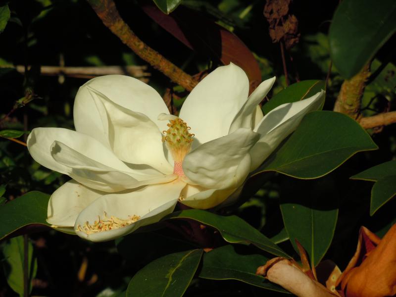 Magnolia grandiflora "Gallisionaire", im Abblühen.Immer wieder starkduftende Blüten, die in der trockenen Hitze weitstreichen im Garten. Dem Strauch scheint die Trockenheit nichts anhaben zu wollen. Immer wieder geht ne Blüte auf.