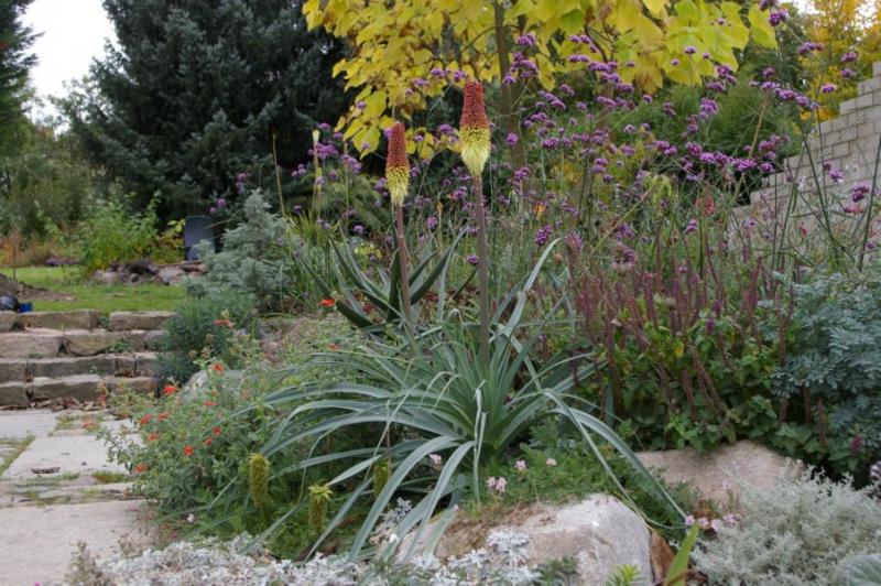 Der Garten ohne Gießen. Dieses Jahr schien es ja echt an die Grenzen zu gehen. Endlich, nach über 4 Monaten mal wieder ein Niederschlag von über 20 mm. Das Schlimmste der Dürre ist überstanden, und schon sieht Kniphofia caulescens wieder saftig aus und die Blüte wird rausgeschoben