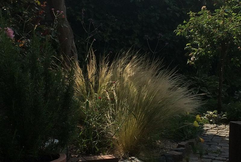 Ich bin überrascht, dass bei günstigem Licht und Blickwinkel sogar mein Chaosbeet gar nicht mal sooo schlecht aussieht. Die Bepflanzung ist noch katastrophal, da ich ursprünglich davon ausgegangen war, dass es sich um ein Schattenbeet handelt. Das ist aber nur im Winter der Fall.