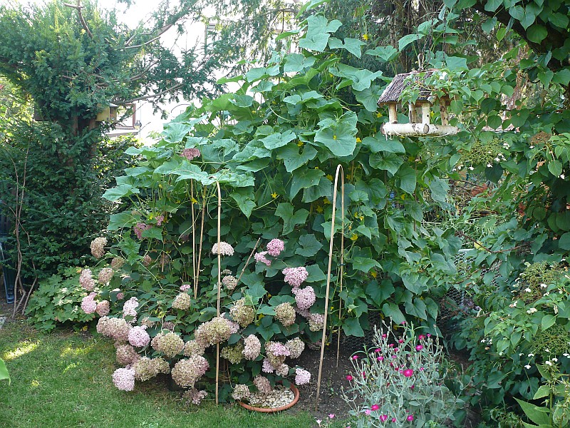 So langsam schwärmen die Gurkenranken aus. Ein Teil erobert die nähere Umgebung, ein anderer Teil hat die Eibe gekapert. Demnächst werden wir Gurken mit der Leiter ernten müssen. Sie blühen sehr reichlich und die Bienen und Hummeln haben ihre Freude daran. Die Blätter, die sich im inneren Dickicht befinden, werden zum Teil gelb und sterben ab. Mehltau kam bisher noch nicht vor und ich hoffe, dass es dabei bleibt. Bis jetzt läuft alles gut.