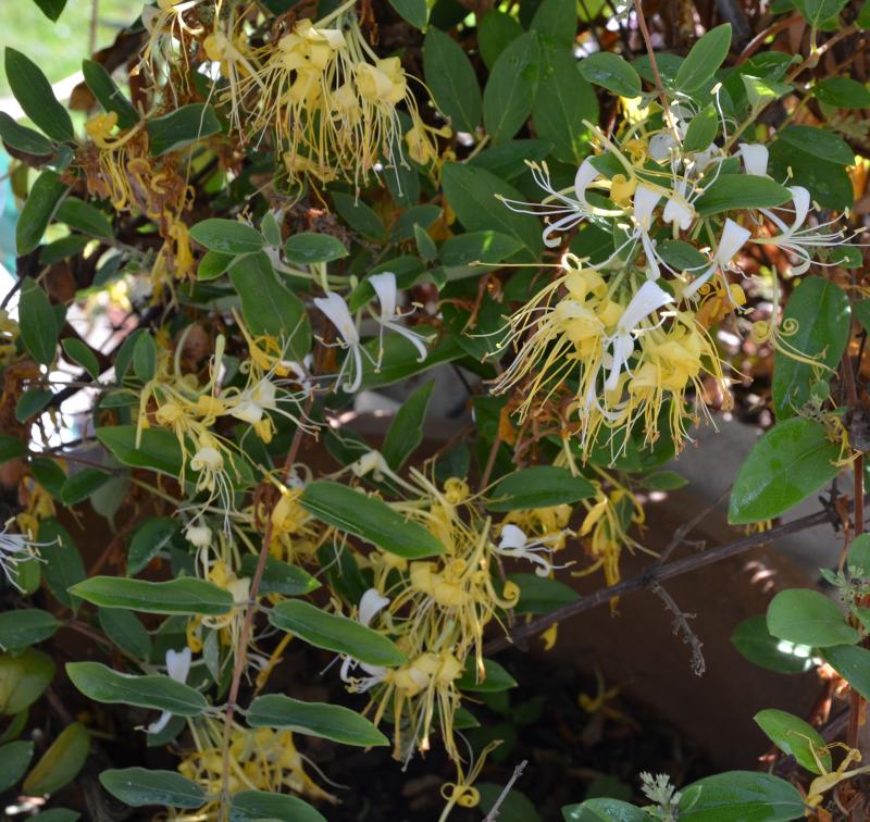 Diese unbekannte Lonicera habe ich letztes Jahr bei Deh..r gekauft. Auf Rückfrage hieß es, sie sei einjährig....Recherchen haben ergeben, dass es sicher Lonicera japonica ist, möglicherweise 'Sweet Isabel' oder 'Genbel'.Mal sehn, ob sie auch härtere Winter (im Kübel) übersteht.