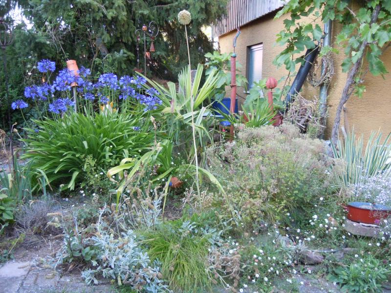 Das "Gras" ist die heimische Weinberg-Segge. Carex humilis "Hexe". Absolut dürrefest und wintergrün.Hier mal das Exotenbeet aus anderer Perspektive. Leider ist das Licht schlecht, Hausschatten liegt auf dem Beet. Hier probiere ich aus. Die Palmen sind Sämlinge einer Palme aus Leipzig. Die Palmen bekommen Winterschutz. Wird wohl nicht ewig gutgehen.Leichter ist der Schutz von laubabwerfenden Agapanthus. Der verschwindet oberirdisch und lässt sich leicht abdecken. Wo Fackellilien dauerhaft wachsen, sollte auch Agapanthus gehen. Meine Fackellilien (Alcazar) hab ich damals übrigens auch alle verloren.