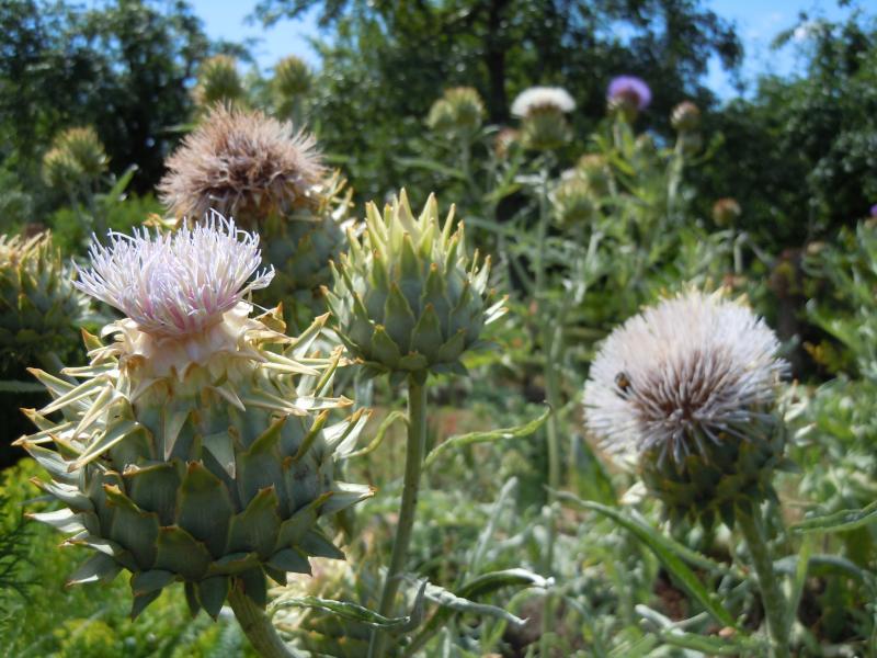 Kardone "Plein Blanc Inermeé" (himmeligblau) und Kardone "Gobbo di Nizza" (lila, im Hintergrund)Die Grundblätter sterben so nach und nach ab. Die Blütenstände bleiben stehen. Ein "Distel" halt. Nach der Blüte treiben die Blätter wieder aus. Die Pfahlwurzel versorgt die Pflanze auch bei Dürre ausreichend.