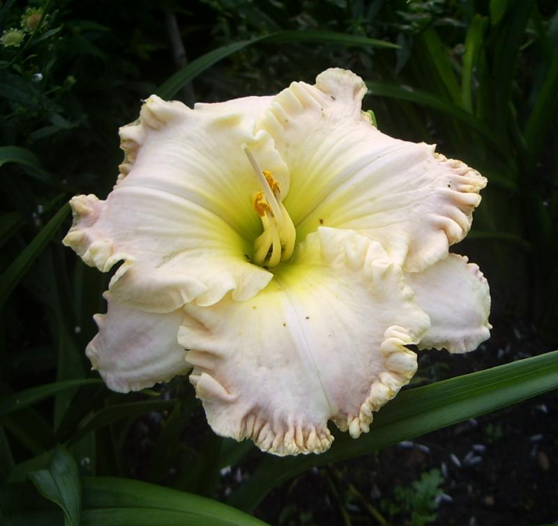 ... und kann euch sagen, es ging nicht gut... Das Blümchen hatte sich total in seiner Rüsche verhakelt und dann auch noch die volle Wasserdröhnung über Nacht abbekommen, da war echt nichts mehr zu machen, auch keine "Geburtshilfe" zu leisten.Aber: Die Knospe links im Bild ging heute auf und hat es damit wettertechnisch besser getroffen, denn heute blieb der Regen aus. Das sah dann so aus:Snow Empress