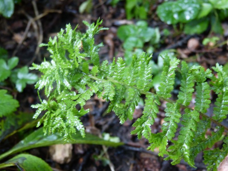 Dann habe ich mir Athyrium filix-femina 'Frizelliae' nochmal genauer angesehen. Er hat jede Menge Wedel. Ob es mehrere Pflanzen sind, kann ich nicht feststellen. Die unförmigen Wedel beginnen typisch, machen dann im oberen Bereich einzelne Ausreißer...