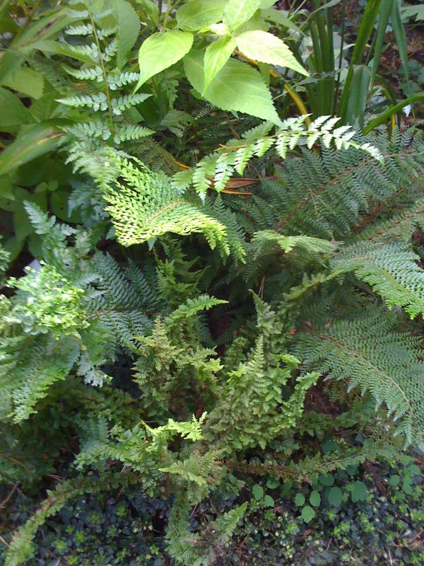 Gedränge im Stubben - li. Dryopteris Kultivar, hinten Arachniodes standishii, re. Polyst. set. Seestern, vorn Athyrium ff. Nanum