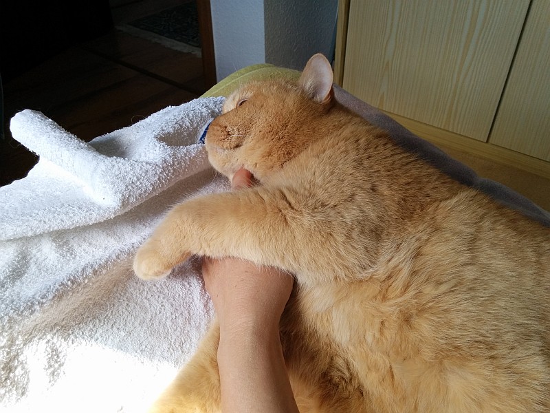 Der Kater tut mir auch leid. Ich behaupte sogar, der sucht schon eine geraume Weile ein neues Zuhause. Aber mit Liese, ich glaube nicht. Und zum Kastrieren, wenn es dazu käme, ist der bestimmt schon recht alt. Lieschen sitzt jetzt immer oben auf der Eingangsstufe wie Cerberus persönlich. Die Wache nimmt sie sehr ernst. Dafür gibt sie dann drinnen die Prinzessin auf der Erbse, siehe unten.