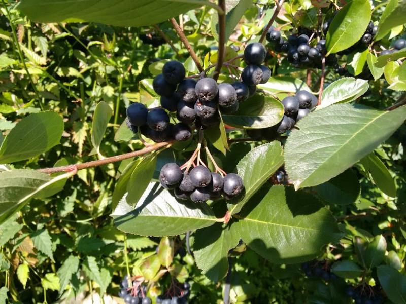 Was haben meine Nachbarn hier für einen Strauch? Steht im fünften Jahr, ist jetzt mannshoch, und trägt zum ersten Mal diese Früchte. Aronia, war meine Idee?