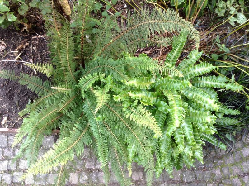 Polystichum setiferum 'Madame Patti' ist mein einziger ausgewachsener Weicher Schildfarn, sieht noch etwas gequetscht aus, da er bis vor kurzen von einer Hosta bedrängt wurde, die ich rausgeschmissen habe. Daneben Asplenium scolopendrium 'Crispum', der sich von meinen Hirschzungen eindeutig am besten bestockt.