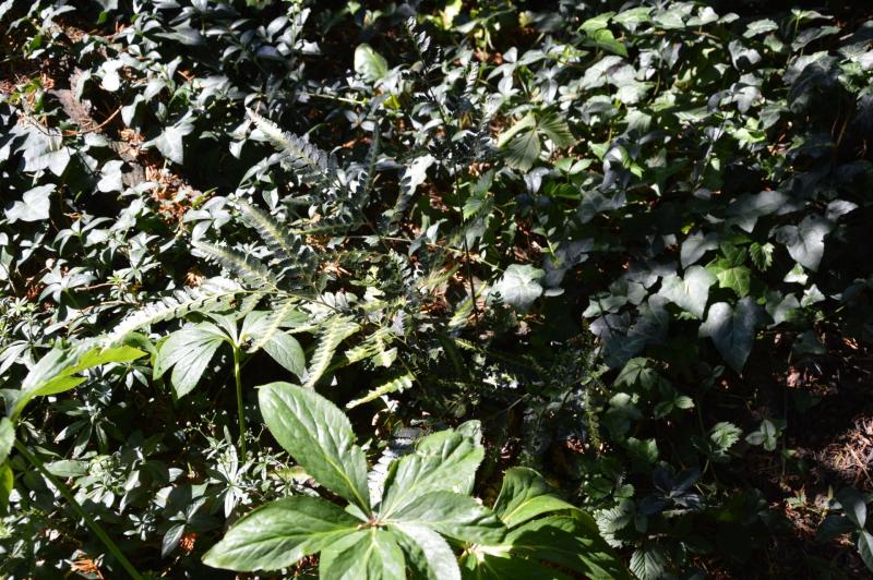 Schlecht erkennbar durch die Sonne Arachniodes simplicior 'variegata', auch erstaunlich trockenheitsrobust (hingegen ist Arachniodes standishii völlig welk und sieht momentan nicht so aus, als ob da noch was wiederkommt)