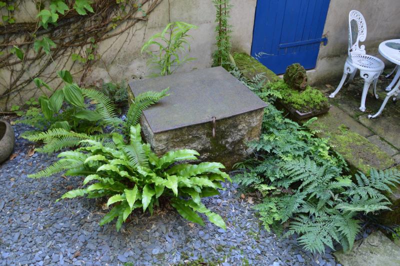 Hier die Umgebung, entgegen dem Uhrzeigersinn: hinten der Lygodium, daneben links Coniogramme japonica, Polystichum vestitum (etwas versengt), eine Cystopteris-Art (wahrscheinlich fragilis), Polystichum munitum, Asplenium scolopendrium, Asplenium trichomanes, am vorderen Ende des Adiantum venustum-Streifens steht Athyrium otophorum var. okanum, am hinteren Ende des Adiantum Athyrium niponicum 'Purple Garden', zu seinen Füßen als Bodendecker und auf dem Bild nicht sichtbar Hypolepis millefolium