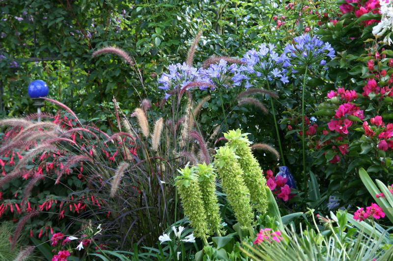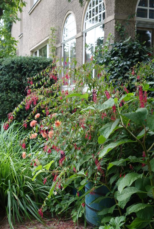 Toll, was bei euch so im Kübel wächst.Meine Bougainville habe ich gerade entsorgt, weil sie immer noch nicht einmal Knospen aufwies, auch letztes Jahr kaum geblüht hat. Für solche Zicken habe ich keinen Überwinterungsplatz! :-XElis, was ist denn das für ein schönes Gras?Im Foersterschen Senkgarten gab es unter einem Baum eine schöne Kübel-Beet-Kombi: