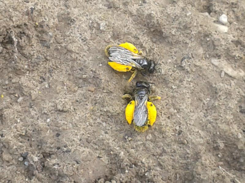 Welche Wildbiene sammelt ihr hier munter Pollen. Sie ist relativ klein.