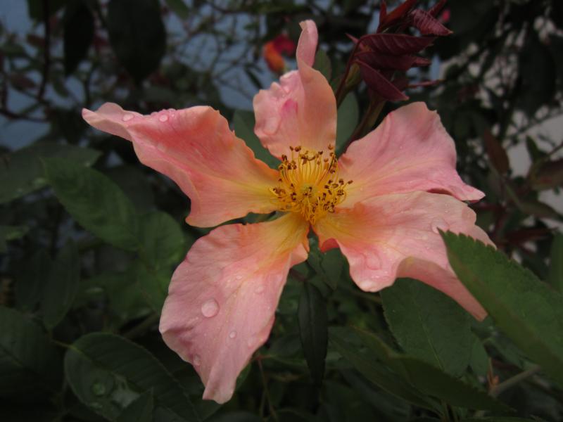 Heute Mittag hat nach dem Regen es mich auch noch mal raus gezogen, zwar gab es keine Sonne, aber dafür Tropfen auf den Rosenblüten.Hier Stanwell Perpetual