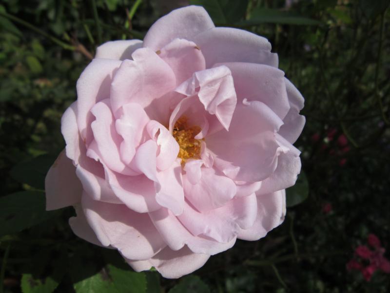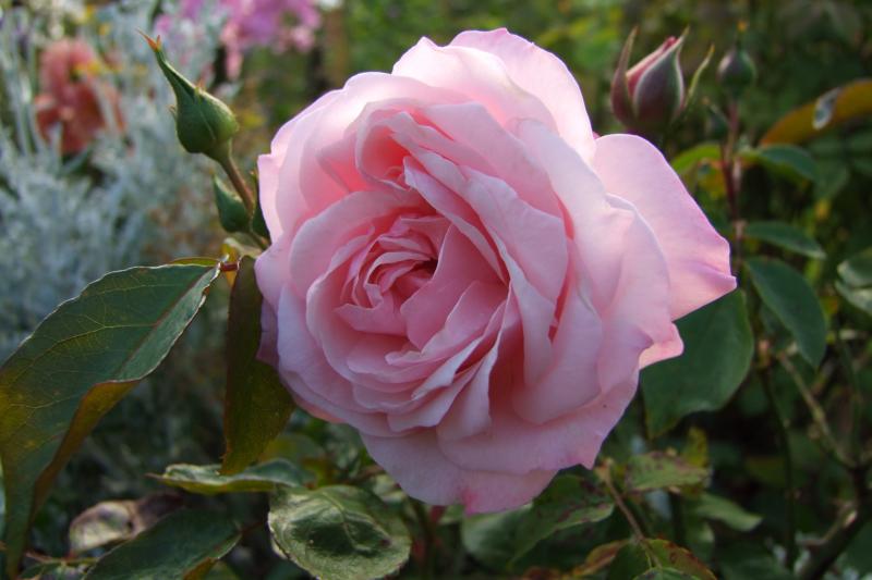 Rosengemisch: Stanwell perpetual blüht noch, R. glauca daneben hängt schon voller Butten