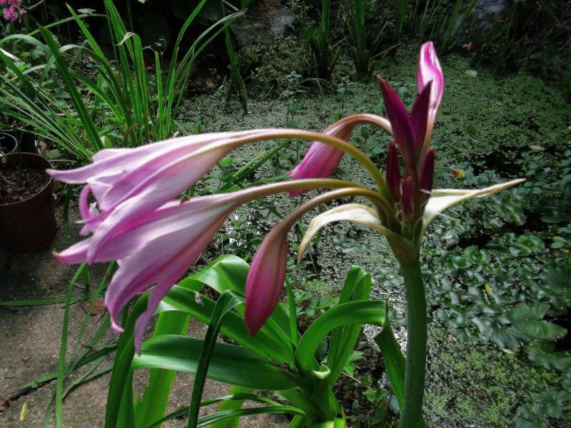 Hier blüht z.Zt. × Amarcrinum memoria-corsii, eine Hybride aus Amaryllis belladonna × Crinum moorei.
