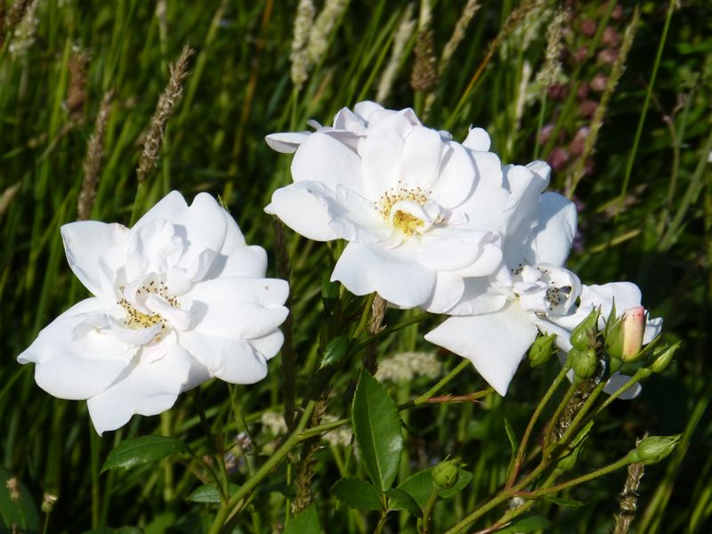 Rosengemisch: Stanwell perpetual blüht noch, R. glauca daneben hängt schon voller Butten