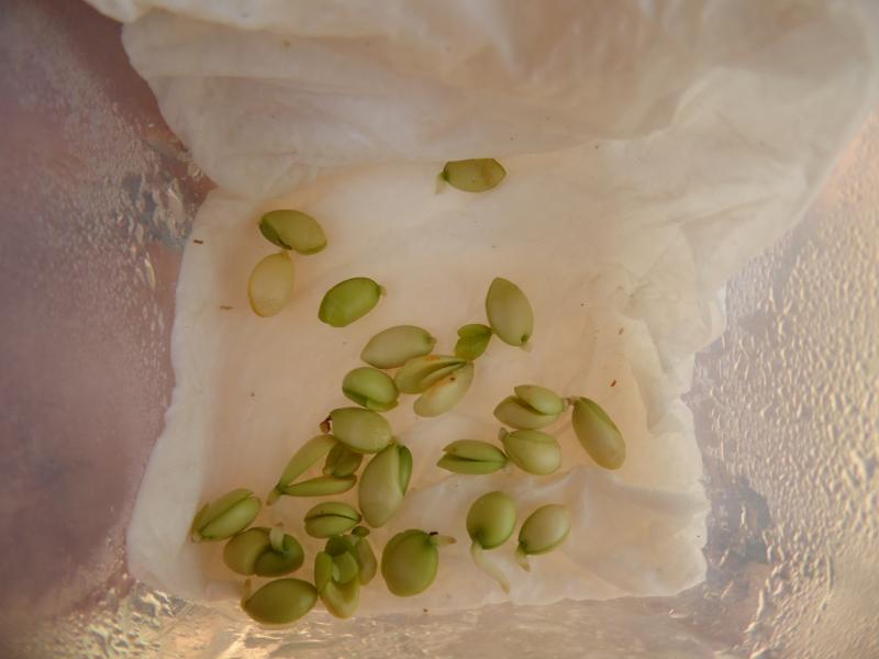 Für die Marmeladenherstellung hatte ich ein paar wirklich schöne saftige Zitronen. Die gewaschenen und eingeweichten Samen habe ich letzten Freitag (vor 3 Tagen) geschält. Zuerst wurden die Samenschale entfernt und dann das dünne Häutchen. Die Samen kamen in feuchtem Küchenpapier eingeschlagen in ein transparentes Kunststoffdöschen mit Deckel. Der Behälter steht in der Wärme und im Licht.Die Anleitung dazu fand ich im Netz. Der User 'citrusgaertner' hat diese Methode auch mal für Aprikosen, Pfirsiche usw. vorgeschlagen.Gestern habe ich die beginnende Keimung entdeckt. Heute sehen die Samen schon so aus.