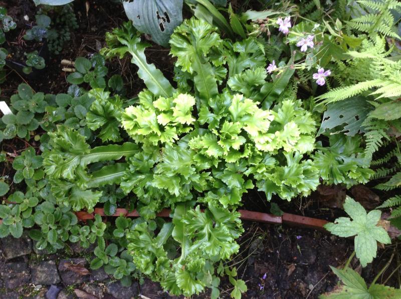 In meinem recht üppig wachsenden Asplenium scolopendrium 'Cristatum', mit seinem fedrigen, fächerartigen Kamm, fiel mir vor ein paar Jahren ein etwas andersartiger Typ auf, den ich jetzt endlich verpflanzen konnte, weil die zwei sich eine ganze Weile sehr aneinander geschmiegt hatten, zum Glück ist der Ausreißer eintriebig geblieben... doch zuerst ein Bild von Asplenium scolopendrium 'Cristatum'.