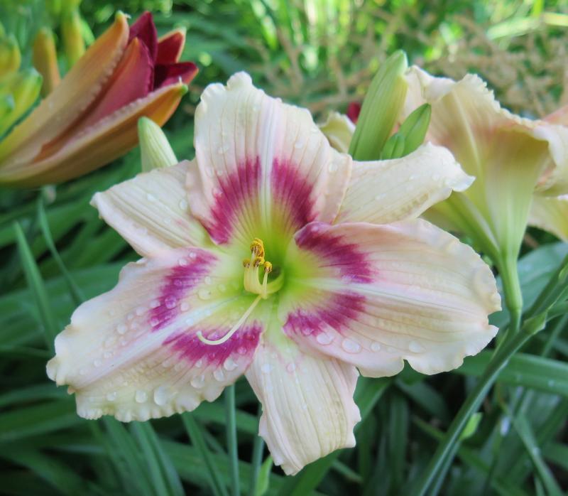 Puuuh... sie ächzen und mühen sich redlich, aber wenn es nicht wenigstens wieder ein bisschen wärmer wird, ist Hopfen und Malz verloren. Wirklich schwierig, da noch einen Anflug von Taglilien-Ästhetik auf's Bild zu bannen. Hier Satin Glass von heute auf einem viel zu dünn geratenen Stielchen und daher bogig überhängend...