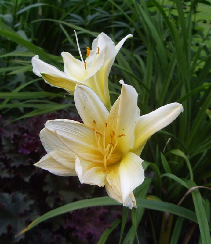 Puuuh... sie ächzen und mühen sich redlich, aber wenn es nicht wenigstens wieder ein bisschen wärmer wird, ist Hopfen und Malz verloren. Wirklich schwierig, da noch einen Anflug von Taglilien-Ästhetik auf's Bild zu bannen. Hier Satin Glass von heute auf einem viel zu dünn geratenen Stielchen und daher bogig überhängend...