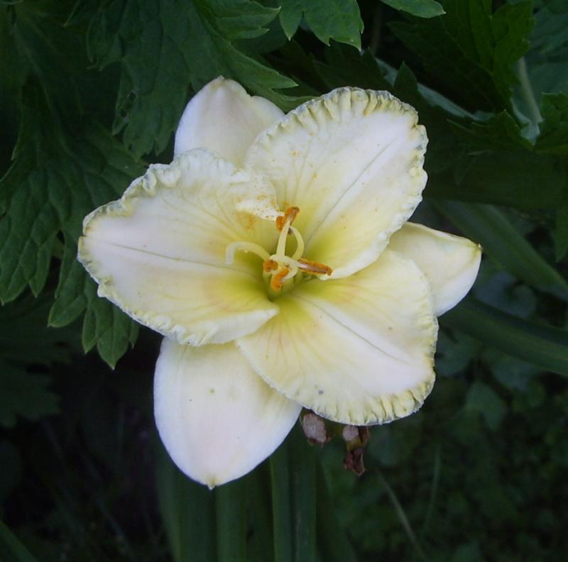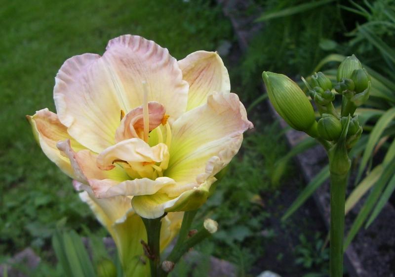 Puuuh... sie ächzen und mühen sich redlich, aber wenn es nicht wenigstens wieder ein bisschen wärmer wird, ist Hopfen und Malz verloren. Wirklich schwierig, da noch einen Anflug von Taglilien-Ästhetik auf's Bild zu bannen. Hier Satin Glass von heute auf einem viel zu dünn geratenen Stielchen und daher bogig überhängend...