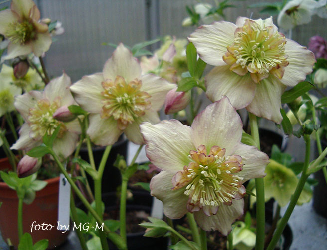 Ich bin total geschafft. Die Belgientour ist sehr umfangreich ausgefallen. Das Arboretum Kalmthout mit seiner Hamamelis-Sammlung und der Helleborusausstellung, sowie 3 weitere Helleborusgärtnereien haben wir heute abgegrast. Aber wie zu erwarten - relativ wenig in Blüte. Trotzdem war der Kofferraum voll. Aber auch mit schön gezeichneten Cyclamen coum, einigen Galanthus elwesii (u.a., leider immer noch nicht das elegante 'Kite' - callis, du erinnerst dich?), weitere Schattenpflanzen und natürlich auch ein paar Helleborus.@toto, wenn du auf meinem letzten Foto genau hinschaust, entdeckst du einige weiße Etiketten. Sie markieren die zur Kreuzung benutzten Blüten. Die Besitzerin ist also ziemlich aktiv dabei, gezielt Samen zu produzieren.@Christiane, dein Eindruck täuscht dich nicht. Die Blüten schauen den Betrachter voll an. Naja, Vorbehalte hatte ich zunächst weil diese Blüten sehr dominant sind. Sie ordnen sich im Garten nicht unter, sondern verlangen eine absolute Sonderstellung. Sie sind wirkliche 'Schmuckstücke'.