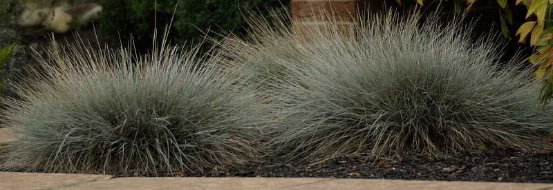 Festuca cinerea - das bläuliche Silber finde ich sehr edel, vor allem auf dem dunklen (Rindenmulch-)Grund - wie auch Sesleria autumnalis machen hübsche, halbrunde Horste. Bei Festuca breiter als hoch, bei Sesleria ohne Blüten ziemlich genau halbkugelig, mit Blüten höher als breit.