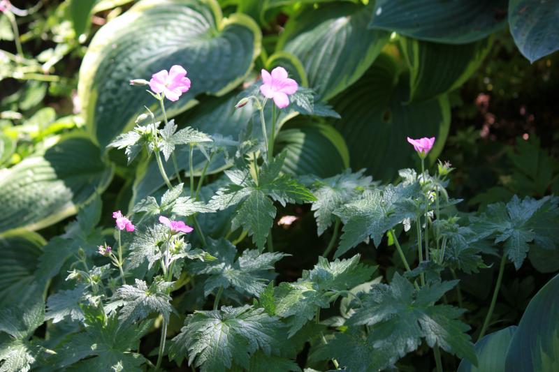 .. außer grünlaubigen Hostas habe ich auch schon blaulaubige Sorten ausprobiert in Kombination mit Geranium x oxonianum, das sehr viel Schatten verträgt. Pseudofumaria sät sich hier besonders gern aus im Rhododendronbeet und blüht fast durchgehend.