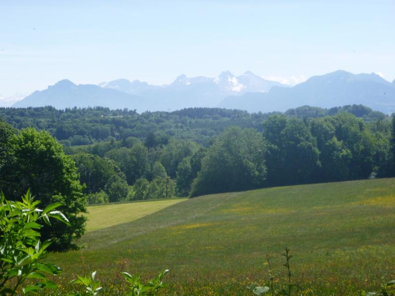 So sieht es ringsherum bei uns aus. Die Berge im Hintergrund sind fast 3000 Meter hoch und dort wo man die Wolken sieht, ist der MontBlanc! Chamonix ist nicht weit entfernt.