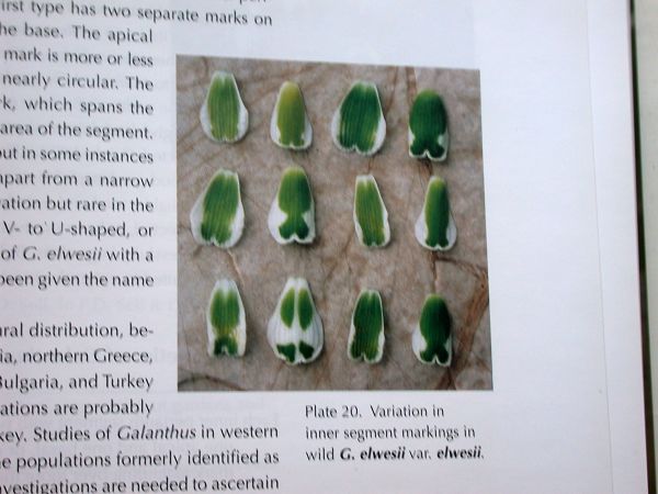 Ich habe mal in der Galanthus-Bibel von Bishop/Davis/Grimshaw nach G. elwesii geschaut und auf S. 33 folgende Varianten gefunden und abfotografiert (leider ohne Blitz nicht ganz scharf, aber mit Blitz hätte es reflektiert).Ganz schön verwirrend, was?Vor allem hat doch G. elwesii zwei grüne Zeichnungen auf den inneren Blütenblättern, oder?