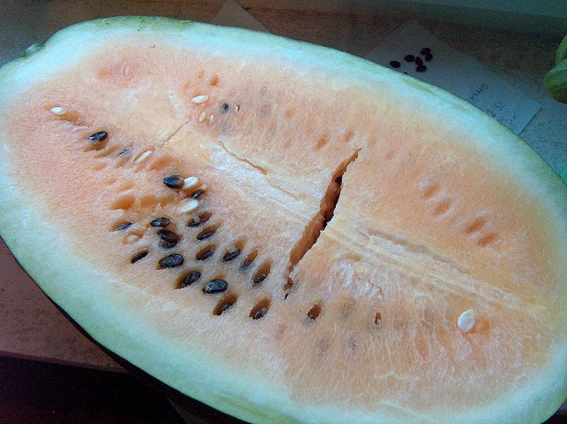 Vor Wochen habe ich das Gewächshaus ausgeräumt, übrig gebliebene Paprikas und Tomaten sowie (kleine) Wassermelonen in eine Kiste gelegt und diese in einen kühlen Raum gestellt. Gestern schnitten wir eine der Melonen auf. Sie war innen rosa und hatte erstaunlicherweise etwas Süße sowie Melonengeschmack.