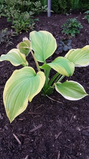 Jule, direkt nach dem Austrieb hatte diese Hosta sehr viel Ähnlichkeit mit der 'First Frost', von der sie abstammt, also zunächst deutlich gelbrandig. Später im Jahresverlauf wurde der Rand dann fast weiß, während er bei der FF einen Cremefarbton zeigt. B.V. bekommt hier ab ca. 16.00 Uhr volle Sonne. Das Foto zeigt sie im Juni, an einem anderen Standplatz mit Morgensonne: