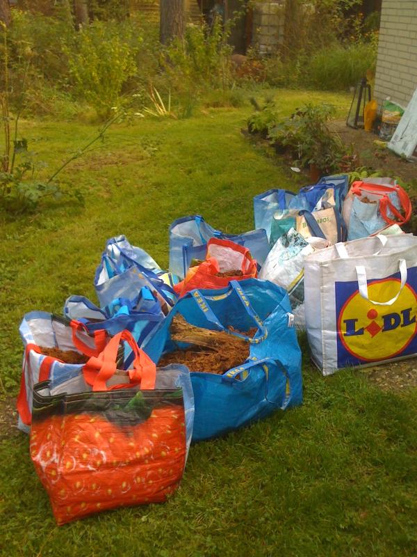 4 Tage auf den Knien oder zwischendurch auch mal auf dem Dups und cm für cm bis 20 cm tief nach Wurzelunkräutern, vorrangig Quecke fahnden, 6 Schubkarren mit Berg: