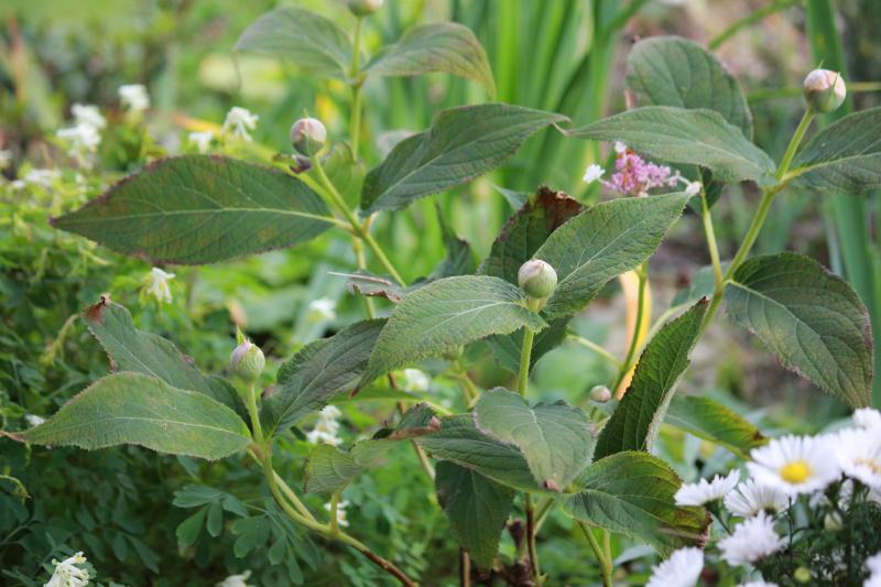 Beneidenswert, diese zahlreichen Hortensiensorten im eigenen Garten zu kultivieren, tarokaja. Nach Deinen herrlichen Fotos zu urteilen, bekommt ihnen das Klima dort bei Dir ganz hervorragend.Hier gibt es hier und da noch einige Nachblüten und die H. involucrata 'Plena' beginnt gerade erst Farbe zu zeigen. Der Asternsämling, der sich dort eingenistet hat, darf noch blühen, dann werde ich ihn umpflanzen.
