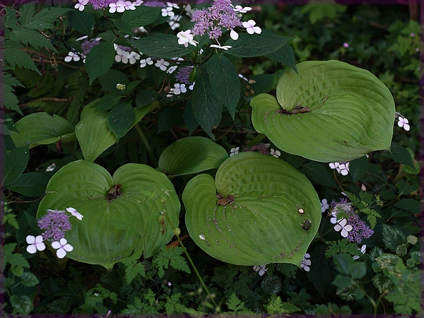 Hier ein verspätetes Sommerbild.Unbekannte Hosta mit Hydrangea "Bluebird".