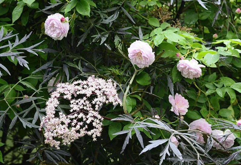 Die Blüten von 'Black Lace' sind hellrosa. Wenn man den Strauch frei wachsen lässt, wird er ziemlich dicht.