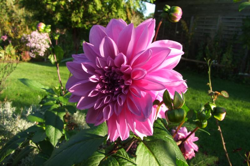 Über einen fremden Gartenzaun fotografiert habe ich diese hübsche Dahlie. Leider war der Hausbesitzer nicht in der Nähe, sodass ich nicht nach dem Sortennamen fragen konnte. Vielleicht kennt sie jemand zufällig?