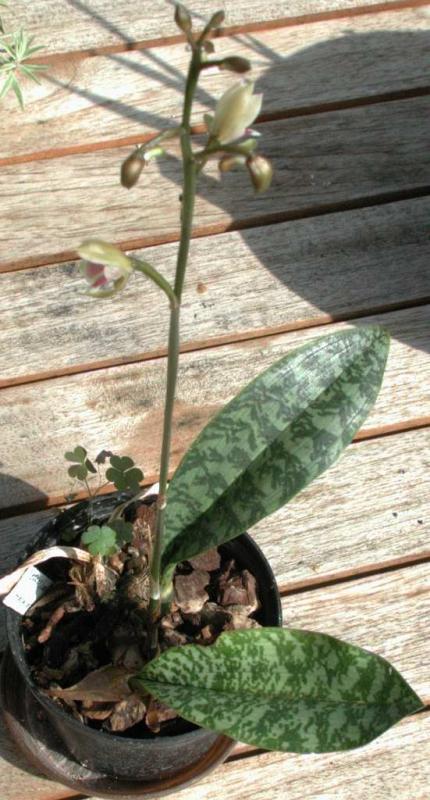 Zunächst noch einmal Macodes petola. Diese Art ist zwar nicht so oft wie die Ludisia, aber dennoch regelmäßig im Handel erhältlich, und zwar meist in Töpfen wie auf dem Bild gezeigt. Sie ist aber ein anspruchsvollerer Pflegling als Ludisia, braucht mehr Schatten und höhere Luftfeuchtigkeit und sollte daher eher in einer Orchideenvitrine kultiviert werden. Auch bei ihr empfiehlt sich Schalenkultur, da sie wie die Ludisia kriechend wächst.