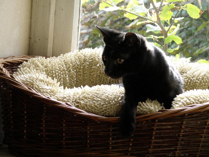 ...........eben kommt Toffee hinter dem Sofa vor und entdeckt mit einem Blick nach oben das Karlchen, wie dieser so in seinem Korb sitzt und sich putzt..........Kein langes Zögern - ein Hopser und Toffee ist auf dem Sofa und geht schnur stracks in Richtung Fensterbrett, steigt an Karlchens Korb vorbei, setzt sich in Sichtkontakt danaben und................putzt sich ebenso