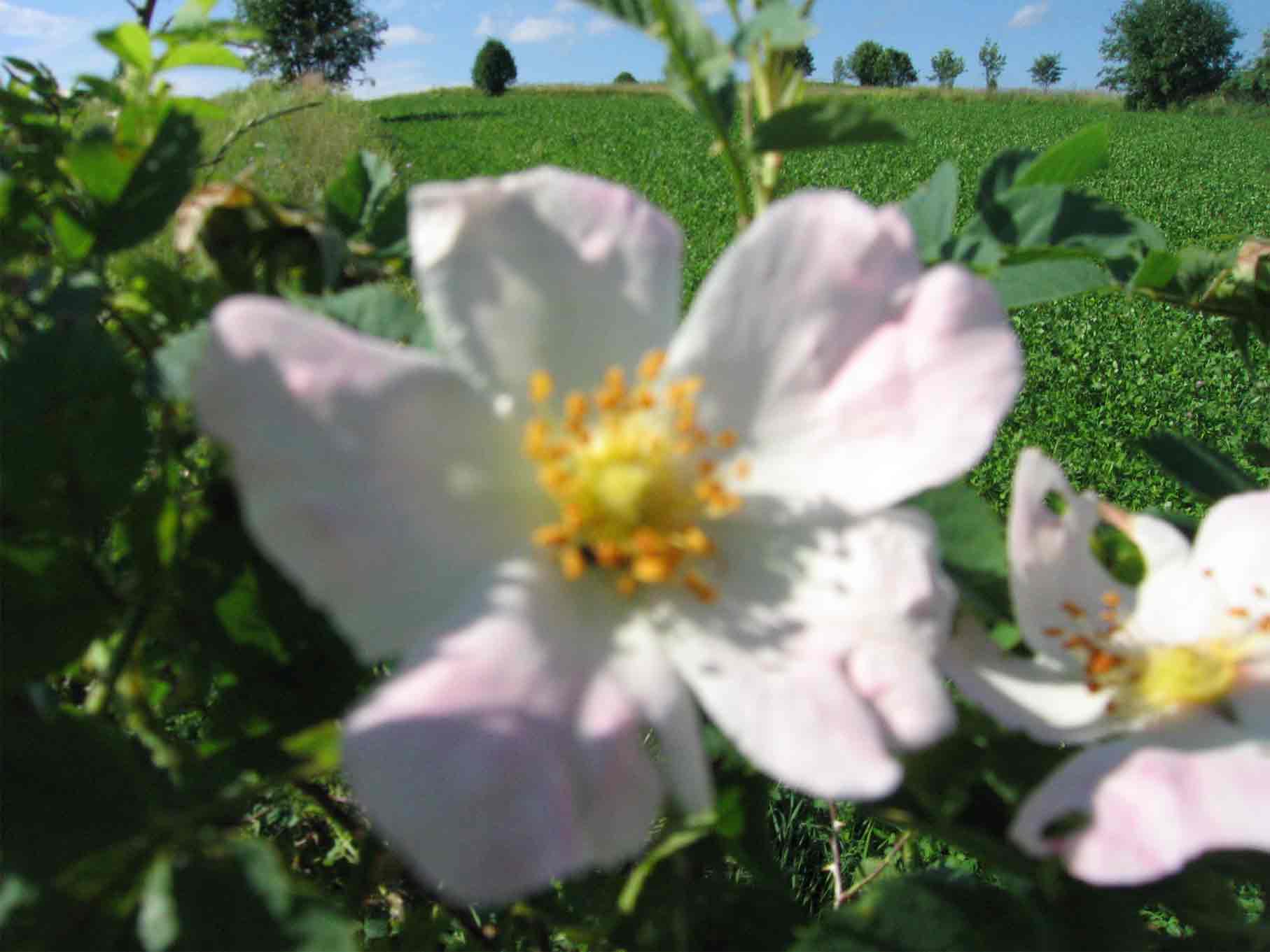 Diese Wildrose fiel mir erstmals im vergangenen Herbst wegen ihrer runden, apfelförmigen Hagebutten auf, die so anders aussahen als jene von R. canina. Auch der Wuchs ist anders, die Triebe sind starr und gehen V-förmig bis waagrecht vom Stamm weg. Nun habe ich gerade noch die letzten Blüten erwischt. Ob jemand weiß, was das sein könnte?lgMartina