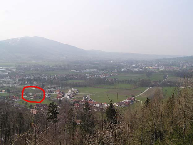 Schöne Fotos - Matthias, besonders der Sumpf gefällt mir.Hier ein Bild von unserem Tal, der rote Ring markiert unser Haus und die lange gerade Straße rechts ist mein Schulweg