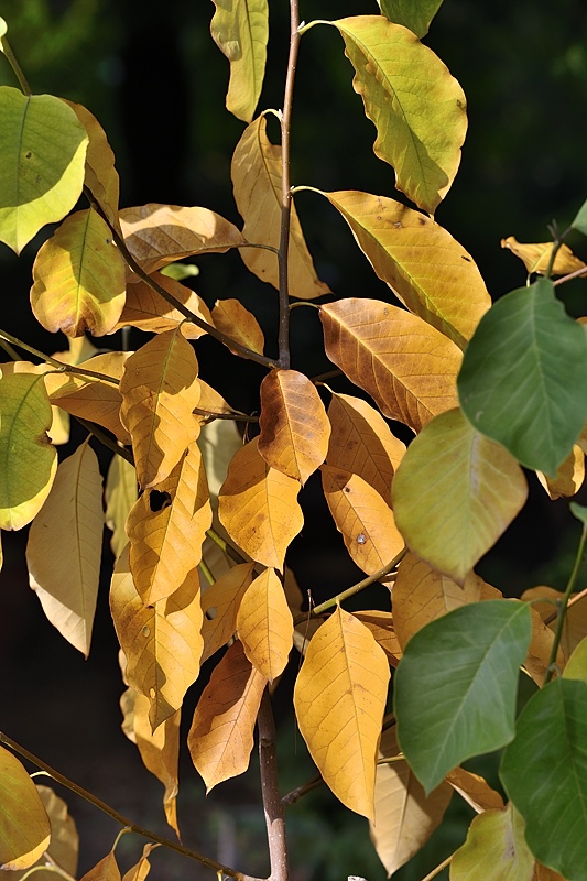 Asimina triloba in leuchtendem Gelb kippt teilweise schon zu bräunlich, was stark der Herbstsonne ausgesetzt ist.
